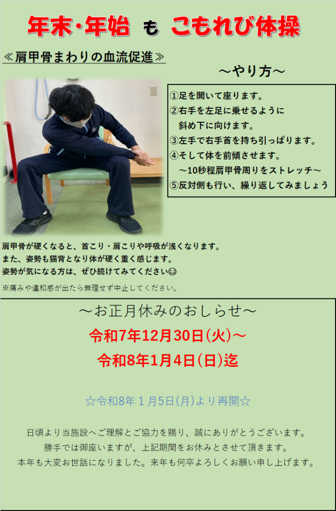 本年もこもれびの舎引山店では「リハビリデイサービス」という事業を通して、近隣地域の皆様方にとっての心地よい憩いの場が提供できますよう、スタッフ一丸となって努めてまいりたいと思います❕
